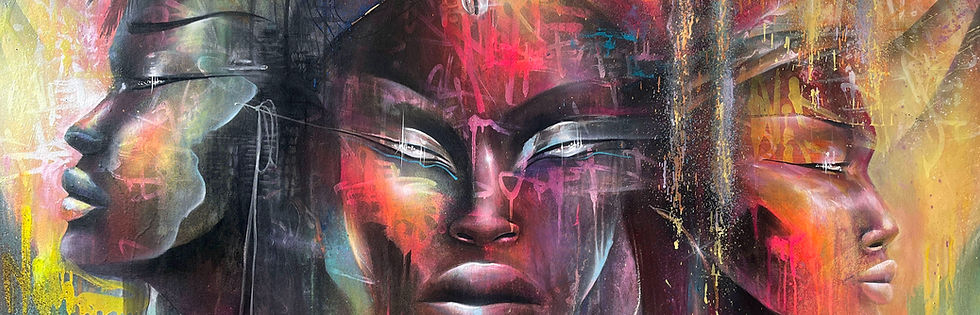 Des figures noires, principalement féminines. Des sirènes des temps modernes, des ancêtres réincarnés, des lieux que l’on porte en soi. Des présences, des auras à la fois diffuses et chargées, parfois traversées par des fragments d'Haïti, d’Afrique et de Montréal. Ses peintures prennent forme dans ces essences qui persistent lorsque tout le reste s’efface. Sa signature visuelle s’ancre dans une peinture contemporaine nourrie par l’héritage du graffiti.